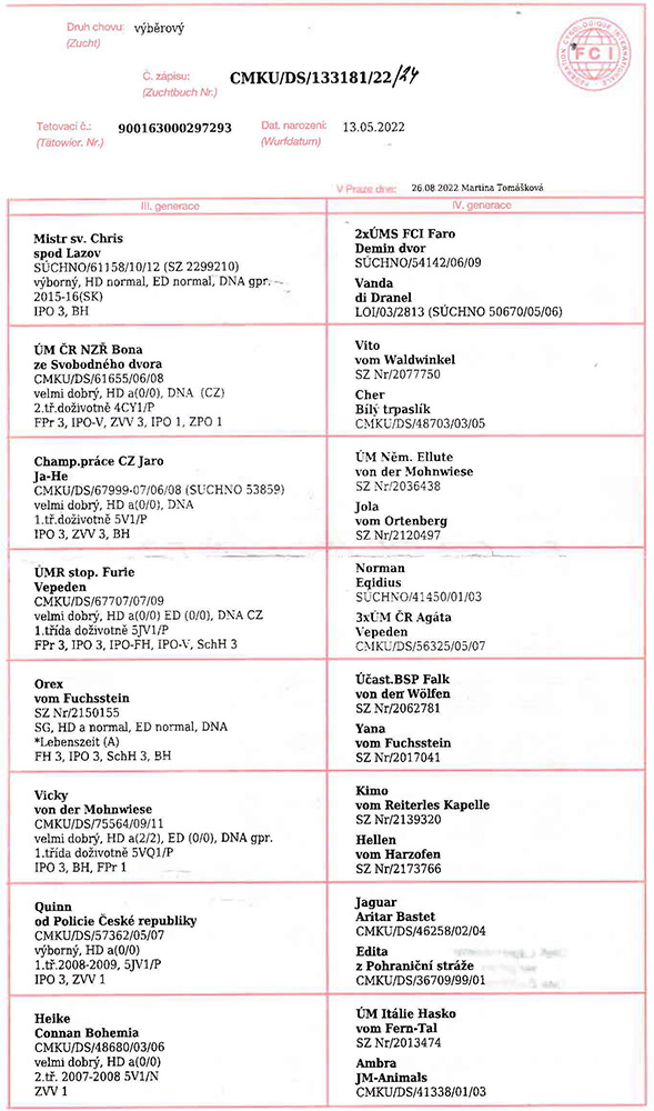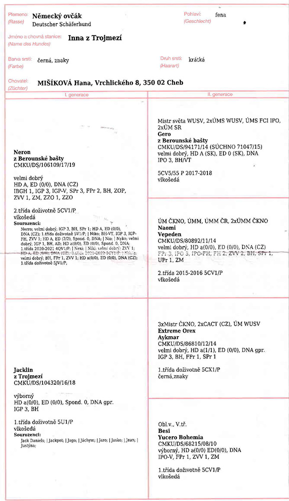 | INNA z Trojmezi, DOB May 13. 2022, elbows: 0/0, hips: 0/0 officially evaluated, titled: ZVV1, surveyed: 4CX1/N, DNA reg..