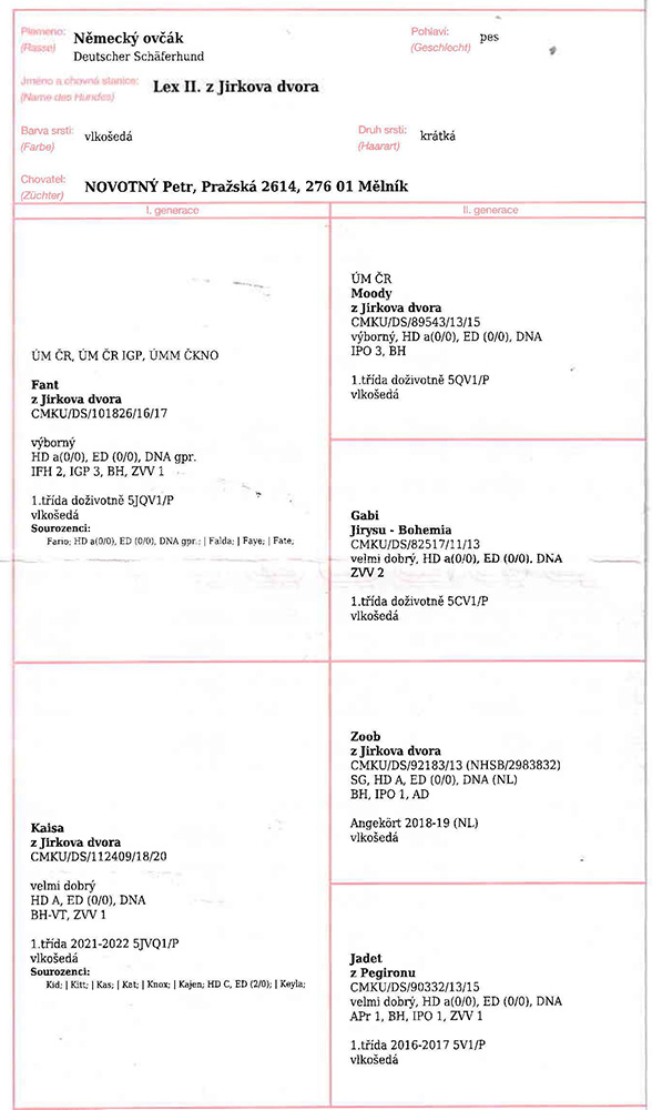 LEX po své matce KAISA z Jirkova dvora náleží rovněž k II. krevní linii a většina předků z této strany rodokmenu byla aktivně využívána v chovném programu JINOPO. Z matčiny strany se opět vyskytuje ALF v. Nordfelsen a to i z postranních linií.