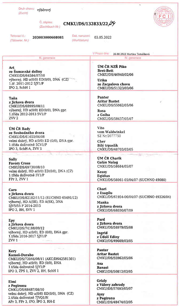 Po své matce BELLA z Ratibořického údolí náleží také do IV. krevní linie a v rodokmenu je zastoupena řada tvrdých psů, kteří se zároveň účastnili vrcholových soutěží.