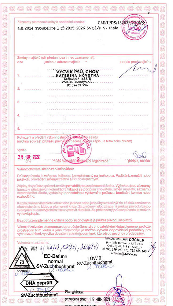 Tento pes je pro nás velmi vzácným přínosem pro chov v JINOPO. Očekáváme od něho předání pevného zdraví , sportovně založené povahy , tvrdosti ale i také vytrvalosti a ochoty k práci.
